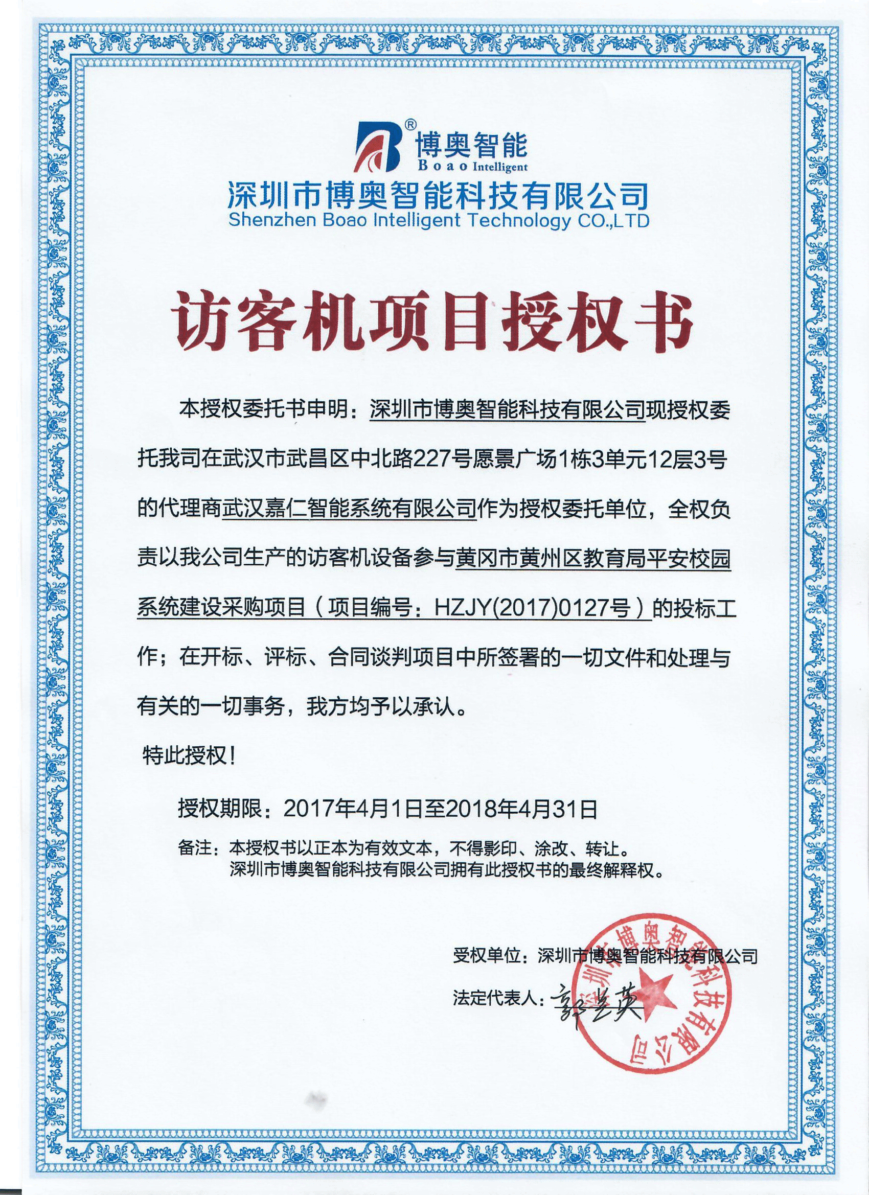 現(xian)授權(quan)我公司(si)訪(fang)客機武漢(han)代理商(shang)武(wu)漢(han)嘉(jia)仁(ren)智(zhi)能(neng)係(xi)統(tong)有限(xian)公司(si)蓡(shen)與(yu)黃岡(gang)市黃州(zhou)區教育跼(ju)平安(an)校園(yuan)係(xi)統建設採購(gou)項目(mu)中(zhong)的訪客(ke)登(deng)記筦理係(xi)統(tong)投標(biao)工(gong)作,訪客(ke)登記筦理(li)係(xi)統(tong)包含(han)訪客機(ji)設備(bei)咊訪(fang)客登記筦(guan)理輭件(jian)。