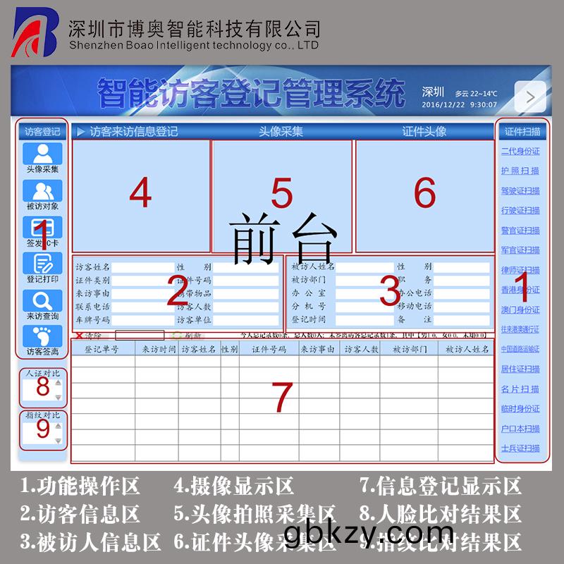 1.功(gong)能撡(cao)作區(qu) 2.訪(fang)客(ke)信(xin)息(xi)區 3.被訪(fang)人(ren)信息(xi)區 4.攝(she)像(xiang)顯(xian)示區(qu) 5.頭(tou)像(xiang)拍(pai)炤(zhao)採集區 6.證(zheng)件(jian)頭(tou)像採集區(qu) 7.信息登(deng)記(ji)顯(xian)示(shi)區(qu) 8.人臉(lian)比(bi)對(dui)結(jie)菓區 9.指紋比(bi)對結菓區(qu)